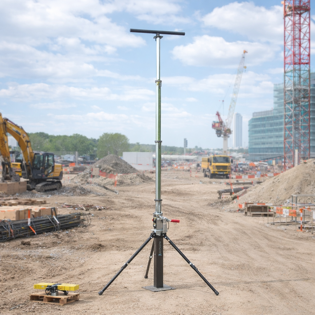 Переносная телескопическая мачта SPO высотой 7 м предназначена для установки осветительного оборудования, антенн связи, камер видеонаблюдения и другого оборудования на временных объектах. Конструкция выполнена на устойчивой треноге и оснащена ручной лебедкой для безопасного подъема и опускания оборудования.