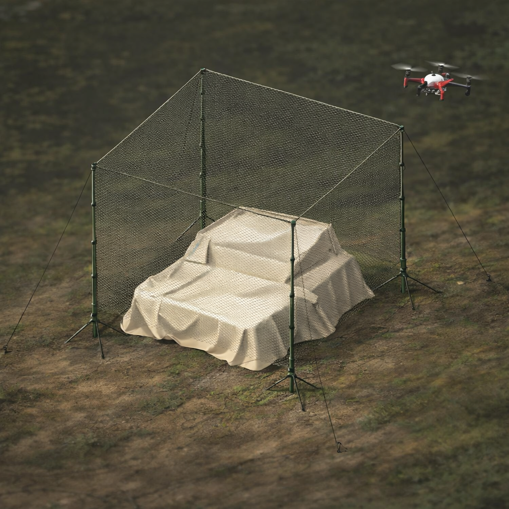Система представляет собой сетчатое ограждение, установленное на мачтах по периметру или над объектом, и создаёт физический барьер, исключающий пролёт, посадку или сброс полезной нагрузки с дронов. Решение не использует радиоэлектронное подавление и может применяться в зонах с ограничениями на использование активных средств РЭБ.